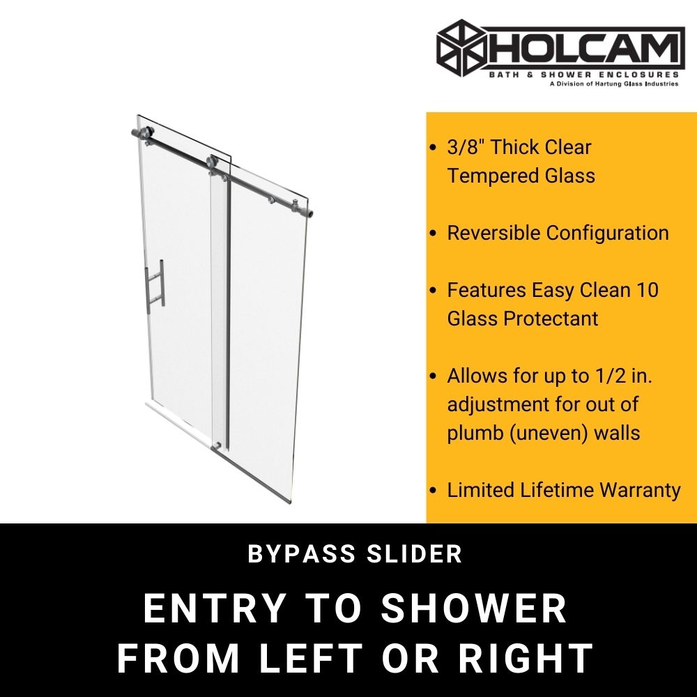 This shower door by Holcam is gorgeous and very sleek. I love the frameless design and quality of the material. This shower door is HEAVY and requires at least two people for installation. The thick tempered glass is scratch resistant and an oil repellent. It is also easy to clean and has less build up due to the materials. The barn door design is modern and will certainly enhance any bathroom. One door slides and the other is fixed in place. This shower is a high end quality product well worth its value. I highly recommend this shower door by Holcam, an established brand for over 95 years.